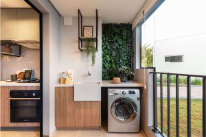 Para garantir que tanto a cozinha como a lavanderia sejam funcionais, é fundamental apostar em móveis planejados. O projeto deve integrar os dois espaços, permitindo que armários sejam instalados para armazenar utensílios de cozinha e produtos de limpeza separadamente, otimizando cada centímetro disponível. Escolha móveis multifuncionais, como bancadas que podem servir de apoio para a área de serviço ou armários suspensos que aproveitem a altura das paredes.
